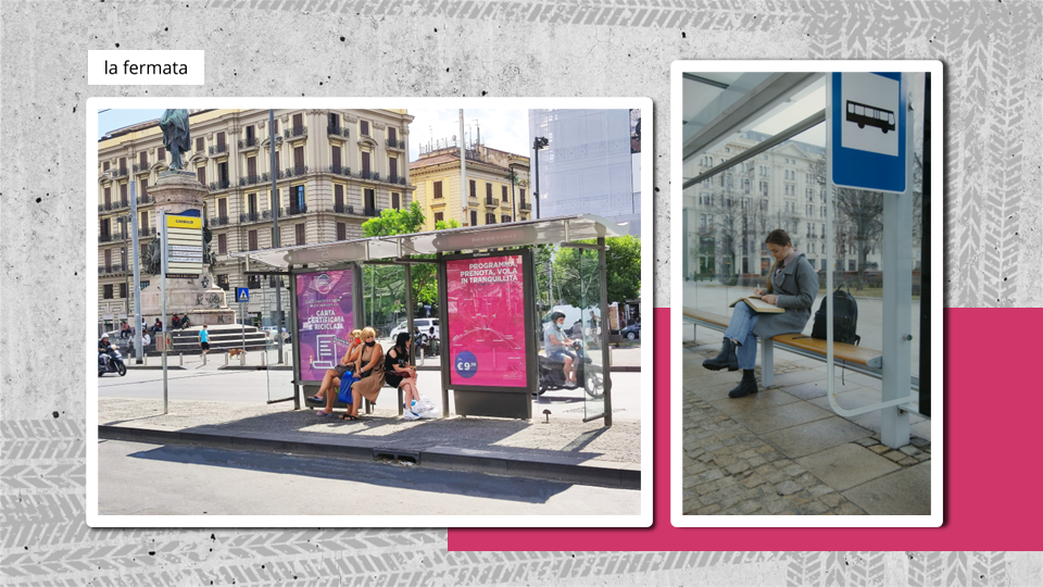 la fermata | Slajd składa się z krótkiego filmu i zdjęcia. Po prawej na filmie widać kobietę siedzącą na przystanku autobusowym. Zdjęcie po lewej przedstawia ludzi oczekujących na autobus na przystanku. Na slajdzie znajduje się napis z nazwą tego miejsca. | Alla fermata puoi leggere dove va l’autobus. |