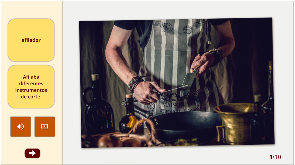 Nagranie dźwiękowe: La profesión del afilador consistía en ofrecer sus servicios de afilar cuchillos, tijeras, navajas y otros instrumentos de corte. En el pasado esta profesión era muy popular, pero ahora ya no existe. La gente afila sus instrumentos de corte sola.