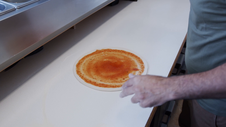 Wideo przedstawiające mężczyznę, który przy pomocy chochli rozprowadza sos pomidorowy na surowym cieście do pizzy.