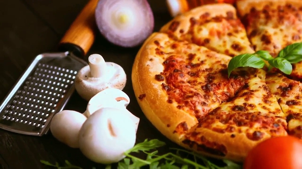 Wideo przedstawia okrągła pizzę w otoczeniu rozmaitych dodatków: pieczarek, pomidorów i rukoli.