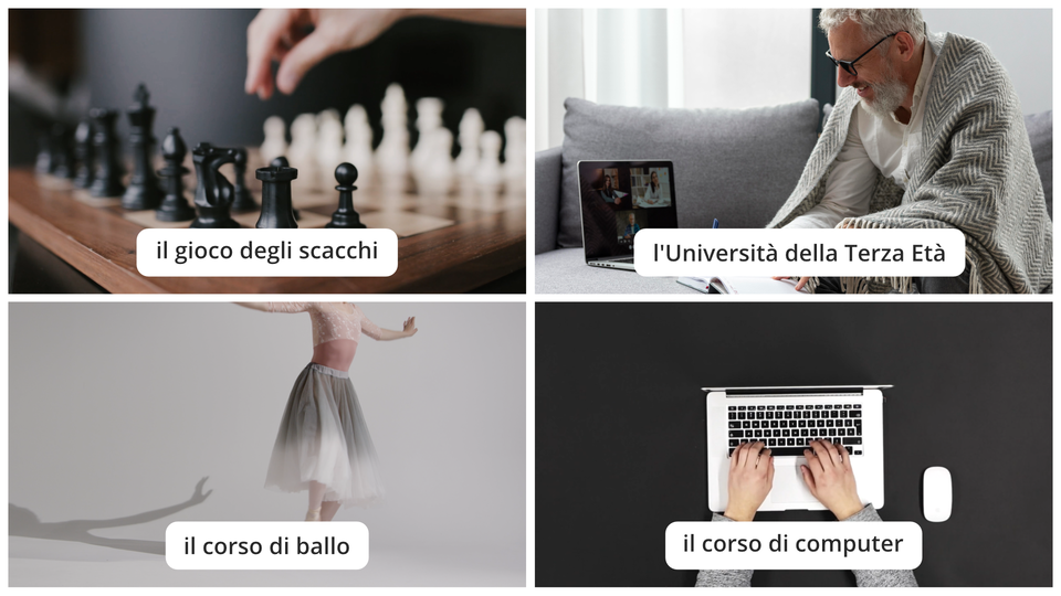 Na slajdzie widocznych jest pięć zdjęć. Każde z nich jest podpisane. Na pierwszym zdjęciu znajduje się kobieta i mężczyzna. Razem gotuję. W tle na ścianie widoczna jest półka z ceramiką kuchenną. Zdjęcie podpisane jest „un lezioni di cucina”. Na drugim zdjęciu widoczny jest bukiet kwiatów. Trzyma je osoba, której widoczna jest tylko ręka. Zdjęcie podpisane jest „le composizioni floreali”. Na trzecim zdjęciu widoczna jest osoba, która hebluje drewno. Zdjęcie podpisane jest „un corso di falegnameria”. Czwarte zdjęcie przedstawia koło garncarskie. Widoczna jest także osoba, która przy nim pracuje. Osoby nie widzimy w całości, widoczne są tylko jej dłonie. Zdjęcie podpisane jest „il corso di ceramica”. Ostatnie zdjęcie przedstawia osobę, która szerokim pędzlem maluje deskę. Nie widoczna jest cała postać, widoczna jest tylko jej ręka. Zdjęcie podpisane jest „il restauro del mobile antico”. | Anche altre offerte sono a portata di mano. Vengono organizzate delle iniziative che permettono di imparare qualcosa di nuovo socializzando. Per esempio diversi workshop, lezioni di cucina o corsi di artigianato che insegnano diverse abilità. Si va dalle composizioni floreali ai corsi di falegnameria, di ceramica o restauro del mobile antico. Qualcosa potrebbe interessarti? |