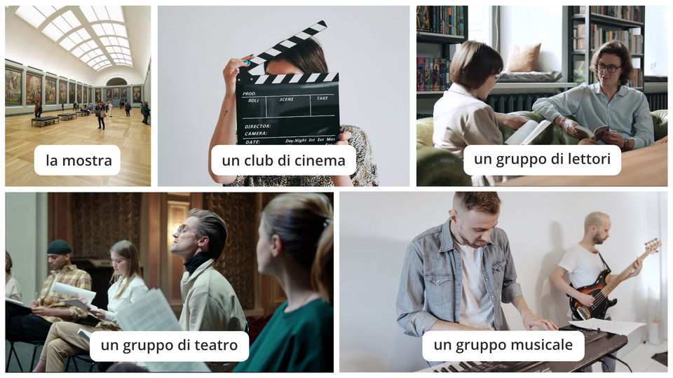 Na slajdzie widoczne są 3 zdjęcia i dwa filmiki. Każde zdjęcie czy film jest podpisane. Pierwsze zdjęcie przedstawia wnętrze muzeum. Widoczna jest ogromna sala z obrazami wiszącymi na ścianach. Zdjęcie jest podpisane „la mostra”. Na drugim zdjęciu widoczny jest klaps filmowy. Trzyma go dziewczyna, której twarz jest zasłonięta. Zdjęcie jest podpisane „un club di cinema”. Trzecią pozycją jest krótki filmik. Widoczne są dwie osoby, które siedzą na wygodnej sofie. To kobieta i mężczyzna. Siedzą zwróceni do siebie, przed sobą trzymają otwarte książki, rozmawiają, gestykulują. W tle widoczne są regały z książkami. Filmik podpisany jest „un gruppo di lettori”. Kolejny filmik przedstawia grupę pięciu osób, które siedzą na krzesłach. Każda z nich trzyma przed sobą kartki. Jeden z mężczyzn wypowiada kwestię. Filmik podpisany jest „un gruppo di teatro”. Ostatnie zdjęcie przedstawia dwóch mężczyzn. Jeden z nich gra na keybordzie, drugi na gitarze. Zdjęcie podpisane jest „un gruppo musicale”. | L’attività culturale costituisce una forma piacevole di passare il tempo libero e contribuisce alla crescita personale. Puoi visitare le mostre, andare a vedere un film e spettacolo, ma anche iscriverti ad un club di cinema o un club di lettori e discutere con gli altri su film visti e libri letti. Perché non fare parte di un gruppo di teatro o di un gruppo musicale? Potrebbe essere una bella esperienza! |