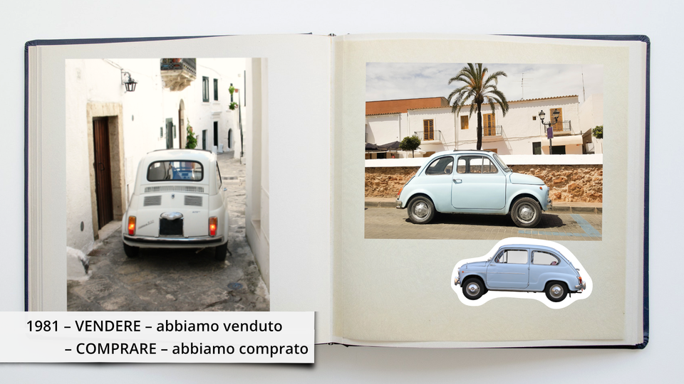 Ilustracja składa się z dwóch zdjęć przedstawiających stary włoski samochód. Na ilustracji przesuwa się również taki sam samochód. Widoczny jest także napis: 1981 – vendere – abbiamo venduto – COMPRARE – abbiamo comprato.