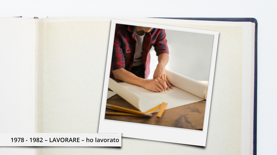 Ilustracja przedstawia krótki film, na którym widoczne są ręce mężczyzny wykonującego rysunki techniczne na kartonie. Na ilustracji widoczny jest napis: 1978 - 1982 – LAVORARE – ho lavorato.