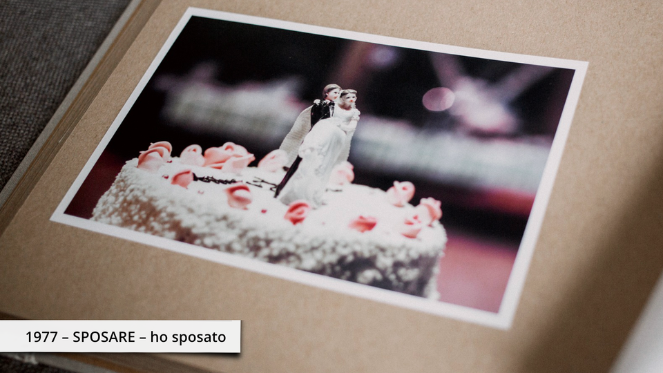 Ilustracja przedstawia krótki film, na którym widoczne jest ślubne zdjęcie w ramce stojące na jakimś meblu. Obok pali się świeczka. Na ilustracji znajduje się napis: 1977 – SPOSARE– ho sposato.