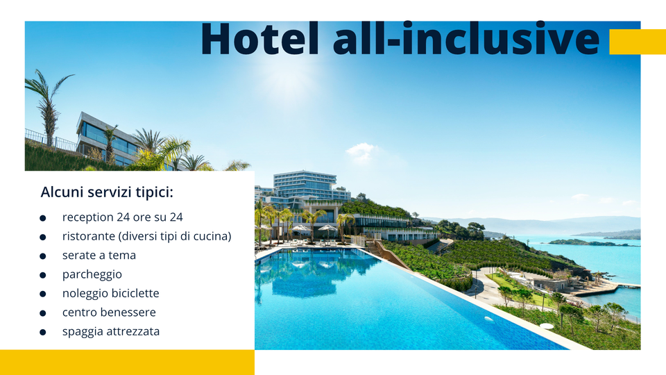 Hotel all‑inclusive | Zdjęcie przedstawia ogromny, ekskluzywny hotel położony nad brzegiem morza z ogromnym basenem. Na zdjęciu, na środku, znajduje się informacja dotycząca udogodnień i rodzajów pokoi: „Tipi di camera: singola, matrimoniale, doppia, tripla quadrupla.” oraz „In tutte le camere c'è: bagno, asciugacapelli, aria condizionata frigobar, TV SAT, wireless.” | In un albergo all inclusive gli ospiti hanno a disposizione diversi tipi di camera. Ci sono per esempio camere singole, doppie, matrimoniali, triple oppure quadruple – dove può soggiornare una famiglia di quattro persone. A volte si può aggiungere su richiesta un altro letto. Alcune camere sono dotate di balcone. Inoltre in ogni camera c'è un bagno con un asciugacapelli e degli asciugamani, aria condizionata, frigobar, TV SAT e connessione Wi‑Fi. |