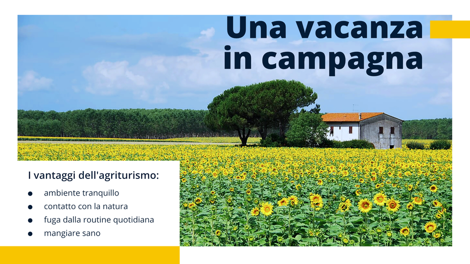 Una vacanza in campagna | Zdjęcie przedstawia duży dom / gospodarstwo agroturystyczne. Wokół widoczne są pola pełne słoneczników. Na ilustracji znajduje się informacja o usługach/udogodnieniach dla mieszkających w gospodarstwie agroturystycznym: „Alcuni servizi tipici: giardino/terrazza a disposizione, cucina tradizionale, rustica, eventi legati alla cultura contadina, lezioni di giardinaggio / di cucina, equitazione, escursioni a piedi, animali ammessi” | Chi sceglie le vacanze in una struttura agrituristica non deve rinunciare a niente. Le stanze sono completamente arredate e attrezzate di tutto il necessario. Di solito a disposizione degli ospiti c’è anche il giardino oppure la terrazza. Nel ristorante vengono serviti soprattutto piatti tradizionali e ricette tipiche della cucina rustica. Vengono anche organizzati eventi e lezioni tematiche per dare ai turisti la possibilità di conoscere la cultura contadina. Chi non vuole stare sempre nello stesso posto, può anche partecipare alle escursioni a piedi e conoscere meglio la zona. Un grande vantaggio è che gli animali domestici sono quasi sempre ammessi. |