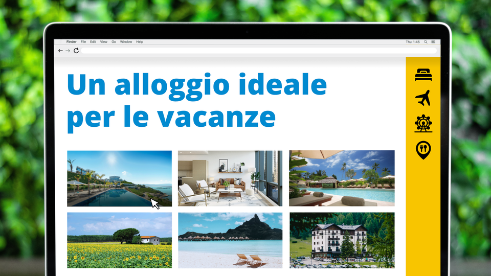 Un alloggio ideale per le vacanze | Zdjęcie przedstawia grafikę tabletu ze stroną biura podróży. Na ekranie tabletu widoczne są mniejsze zdjęcia z różnymi wakacyjnymi miejscami. Po prawej stronie na pasku bocznym znajdują się ikony symbolizujące noclegi, loty, atrakcje oraz wyżywienie. | Chi vuole andare in vacanza deve prima dedicare un po’ di tempo alla pianificazione e alla ricerca di un alloggio perfetto. Questo permette di ridurre lo stress e di evitare amare sorprese. Su internet possiamo trovare tantissimi tipi di alloggi per le vacanze con descrizioni dettagliate. È quindi molto importante leggere tutto con attenzione per poi scegliere un alloggio che corrisponde alle nostre esigenze, ma anche al carattere della nostra vacanza. |