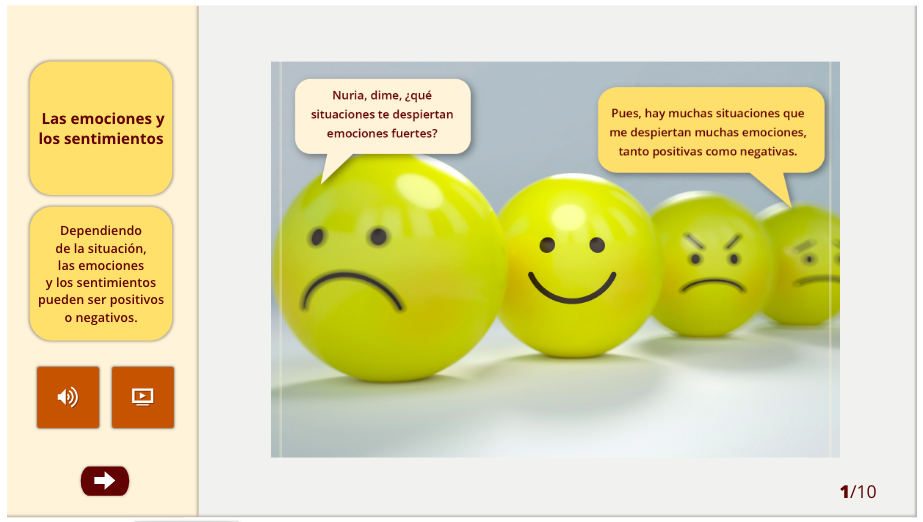 Pierwszy slajd przedstawia zdjęcie pięciu małych, żółtych piłek, na których narysowane są miny wyrażające różne emocje. Na pierwszej piłce narysowana jest smutna mina. Obok niej dymek z napisem: Nuria, dime, qué situaciones te despiertan las emociones fuertes? Na drugiej piłce narysowana jest uśmiechnięta mina. Na trzeciej piłce narysowany jest gniewny wyraz twarz. Na czwartej piłce narysowany jest zmartwiony wyraz twarzy. Obok niej dymek z napisem: Pues, hay muchas situaciones que despiertan muchas emociones, tanto positivas como negativas.