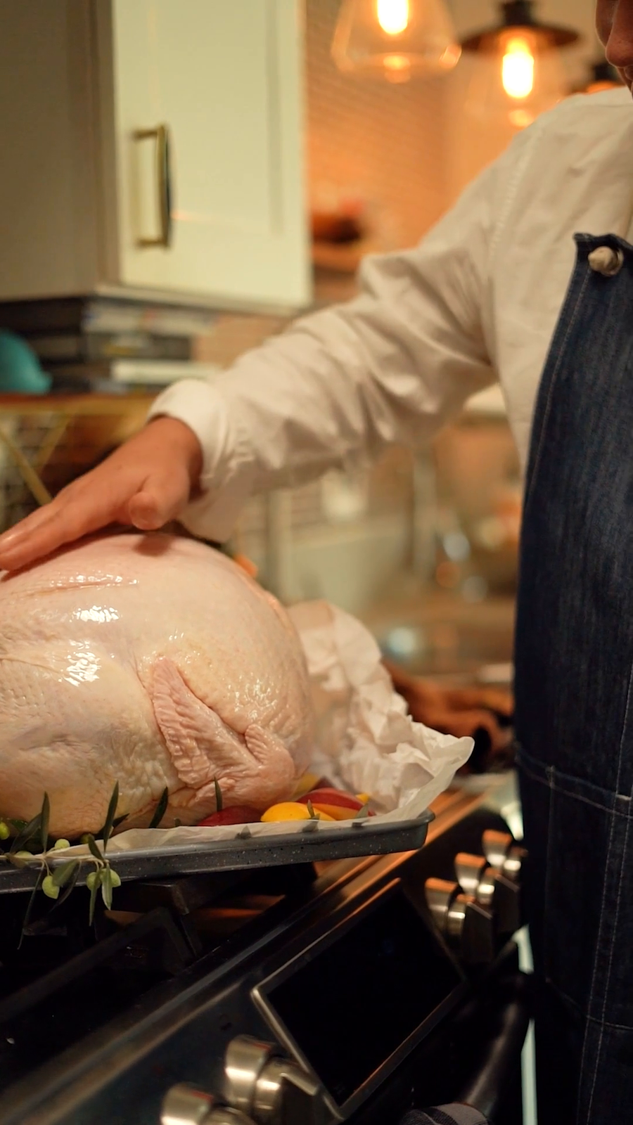 Krótki filmik przedstawia przygotowanie indyka do pieczenia. Po prawej stronie widoczna jest postać, która ma wyciągniętą prawą rękę, którą naciera leżącego na blaszce indyka. Indyk położony jest na warstwie owoców, pod którą znajduje się pergamin do pieczenia. W tle widoczne jest wnętrze kuchni z wyposażeniem.