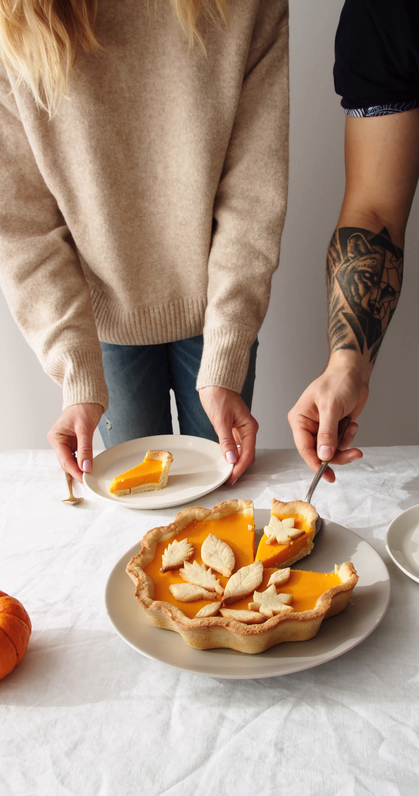 Krótki filmik przedstawia dwie osoby: kobietę po lewej i mężczyznę po prawej stronie, które nakładają na białe talerze tartę dyniową. Przed nimi na blacie, przykrytym białym obrusem, widoczny jest duży płaski talerz, na którym ułożono upieczoną tartę z pomarańczowym wypełnieniem, zdobionym listkami o różnych kształtach. Mężczyzna trzyma w prawym ręku srebrną łopatkę do ciasta i nakłada na talerz dziewczyny ukrojony kawałek tarty, a następnie sięga łopatką po drugi kawałek.