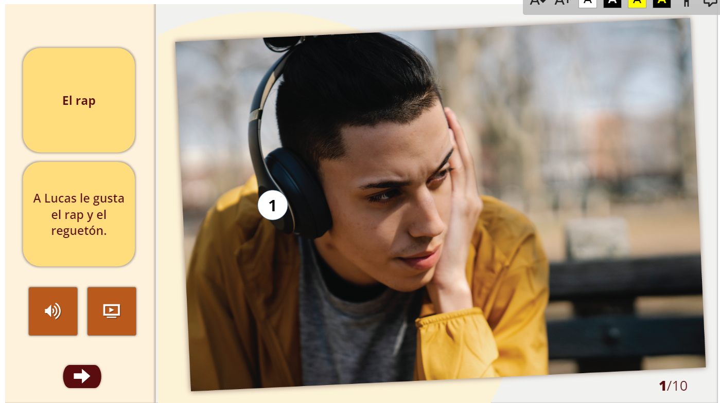 Pierwszy slajd przedstawia młodego mężczyznę w słuchawkach na uszach. Dodatkowa informacja na słuchawkach: el rapero - raper. Opis slajdu: El rap. A Lucas le gusta el rap y el reguetón. Nagranie dźwiękowe: dialog, w tle żywa muzyka- Hola, Lucas. - Hola! - Ah, hola, Claudia. Perdón, no te he oído por la música. - A quién escuchas? - Bad Bunny. - Es un rapero? - Sí, también hace música reguetón. Materiał filmowy przedstawia młodego mężczyznę w słuchawkach na uszach, który robi coś na tablecie. Podpis pod filmem: Lucas escucha a un rapero.