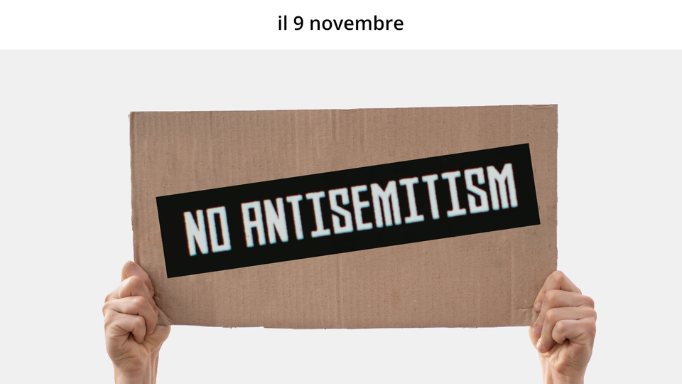 il 9 novembre | Na slajdzie znajduje się krótki filmik przedstawiający plakat z napisem „No antisemitism”. Osoba, której widzimy tylko ręce unosi plakat. | Nel 2020, Le Nazioni Unite hanno proclamato il 9 novembre la Giornata mondiale contro il fascismo e l’antisemitismo. Come l’UNAR (Ufficio Nazionale Antidiscriminazioni Razziali) sottolinea sul suo sito, l’obiettivo della giornata è “non abbassare l’attenzione contro ogni discriminazione e razzismo” e investire nella cultura del rispetto. |