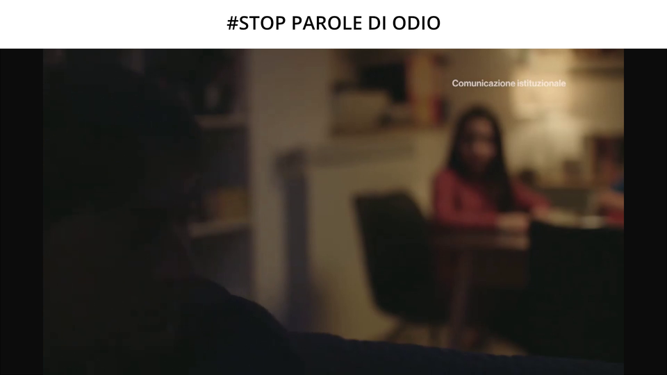 #Stop parole di odio | Na slajdzie widoczny jest spot kampanii rządu włoskiego. Film pokazuje rodzinę. Ojciec siedzi na kanapie, przerzuca pilotem programy. W telewizji widoczne są migawki pełne agresji, hejtu, wyśmiewania, przemocy. W tle widać dzieci grające w scrabble. Proszą tatę, żeby przyłączył się do nich. Tata układa słowo „dividere”. Chłopiec dokłada trzy litery, powstaje słowo „condividere”. Tata tworzy koleje słowo „contro”. Dziecko dokłada dwie litery, powstaje słowo „incontro”. | La campagna #Stop parole di odio pone l’accento sul discorso nella rete con lo slogan: “Ci sono tante parole, scegliamo quelle giuste”. Anche tu, da questo momento, puoi cambiare il mondo, renderlo più civile e far cadere le barriere mentali, se invece di stigmatizzare gli altri con le parole cominci a parlargli e a trattarli con rispetto. Anche quando non sei d’accordo con loro. |