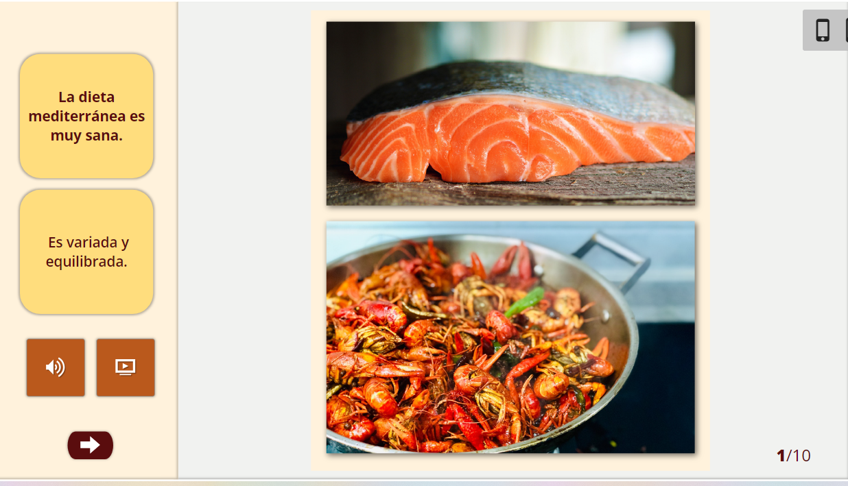 Pierwszy slajd przedstawia dwa zdjęcia. Na jednym widoczny jest kawałek surowego łososia, na drugim patelnia pełna smażonych raków. Opis slajdu: La dieta mediterránea es muy sana. Es variada y equilibrada. Nagranie dźwiękowe: Me llamo Raúl y me encanta la dieta mediterránea. Es muy sana y por eso la sigo. Quieres saber qué se come siguiendo esta dieta? Ya te lo digo. Materiał filmowy przedstawia talerz z kawałkami surowych ryb, owoców morza i kawioru. Podpis pod filmem: La dieta mediterránea es muy sana porque se consumen alimentos variados.Drugi slajd przedstawia stół zapełniony talerzami z jedzeniem. Na jednym talerzu pomidorki koktajlowe, truskawki, rukola. Na kolejnym sery i wędliny. Na następnym plastry jabłka. Na innym talerzu plasterki ogórka, marchewki i krakersy. W miseczce zielone i czarne oliwki. W kolejnej miseczce miały sos jogurtowy a obok biały ser. Na slajdzie znajduje się również pięć punktów z dodatkową informacją. Pierwszy na truskawkach: las fresas – truskawki. Drugi na pomidorkach: el tomate - pomidor. Trzeci na oliwkach: las aceitunas - oliwki. Czwarty na jabłku: la manzana - jabłko. Piąty na ogórkach: el pepino - ogórek. Opis slajdu: Frutas: naranjas, peras, plátanos, etc. Verduras: pepinos, ajo, cebolla, etc. Nagranie dźwiękowe: Lo que más me gusta en la dieta mediterránea es que, siguiéndola, se comen muchas frutas y verduras. Me encanta comer pepinos y tomates. También me gustan mucho las aceitunas y los frutos secos. En cuanto a las frutas, pues, las como menos, pero también me gustan mucho. Mi fruta favorita es la fresa. Materiał filmowy przedstawia stoisko z owocami i warzywami w sklepie, na którym sprzedawca pakuje do plastikowej siatki warzywa i podaje klience. Podpis pod filmem: En la dieta mediterránea se comen muchos alimentos vegetales como, por ejemplo, frutas, verduras o frutos secos.