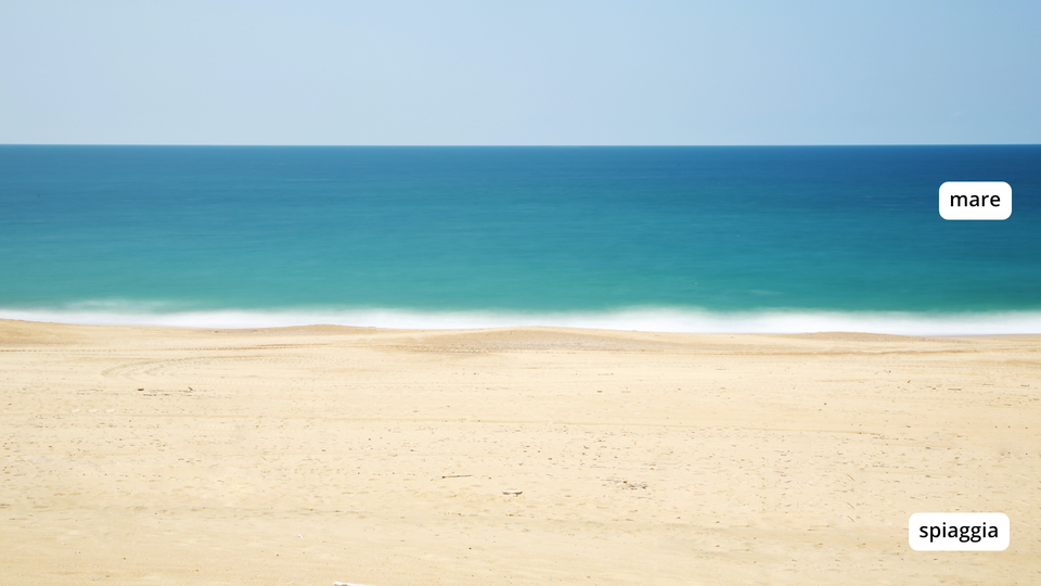 Ilustracja przedstawia plażę i morze. Na slajdzie znajdują się dwa dymki z napisami: „mare” i „spiaggia”. | Nella foto vedo il mare e la spiaggia. |