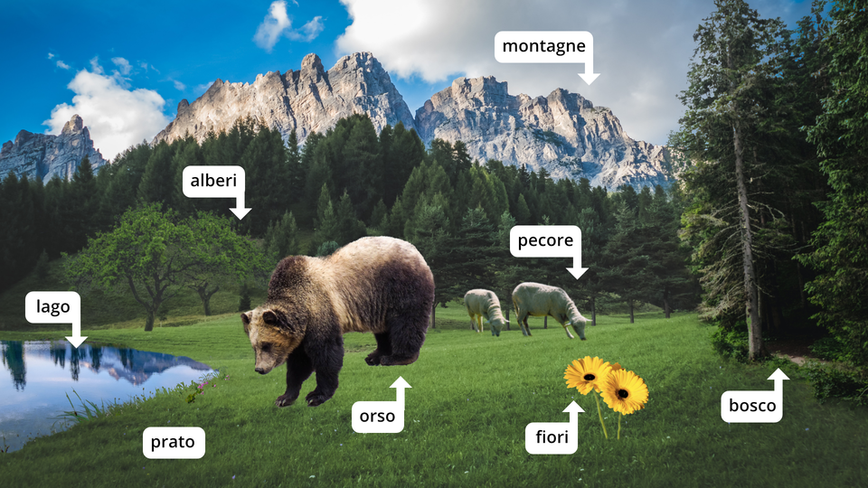 Ilustracja przedstawia krajobraz górski. Na pierwszym planie, po lewej stronie, znajduje się niedźwiedź i napis „orso”. Po prawej stronie znajduje się las i obok napis „bosco”. | A sinistra c’è un orso. A destra c’è il bosco. |