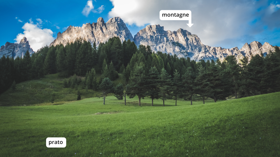 Ilustracja przedstawia krajobraz górski. Na pierwszym planie znajduje się trawa i napis „prato”. W tle widoczne są drzewa i szczyty górskie. Nad górami znajduje się napis „montagne”. | Nella foto vedo le montagne e il prato. |