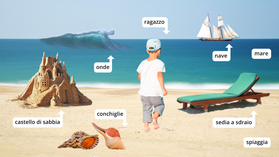 Ilustracja przedstawia chłopca na plaży, nad nim jest napis „ragazzo”. Po lewej stronie znajduje się zamek z piasku i napis „castello di sabbia”, po prawej leżak i napis „sedia a sdraio”. Na pierwszym planie leżą na piasku dwie muszle i obok napis „conchiglie”. W oddali na morzu widoczny jest żaglowiec podpisany „nave”, a po lewej morską falę i napis „onde”. W prawym dolnym rogu znajduje się napis „spiaggia”. | Nella foto vedo il mare e un ragazzo. Ci sono anche delle onde. A sinistra c’è un castello di sabbia. A destra c’è una sedia a sdraio. In primo piano vedo due conchiglie. Sullo sfondo c’è una nave. |