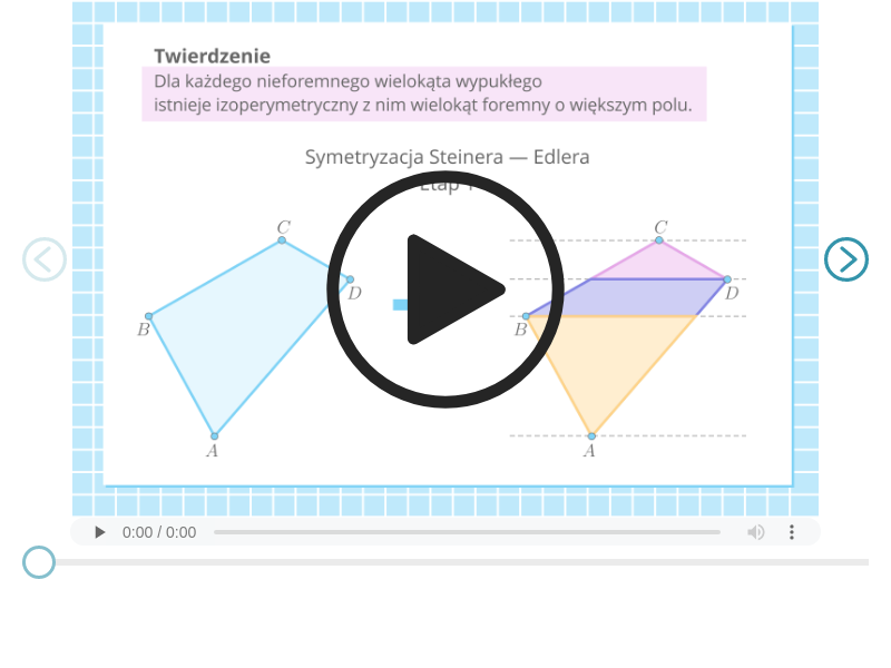 Slajd 1. Nagłówek, twierdzenie. Napis, dla każdego nieforemnego wielokąta istnieje izoperymetryczny z nim wielokąt foremny o większym polu. Symetryzacja Steinera- Endlera, Etap pierwszy. Ilustracja przedstawia wielokąt wypukły A B C D. Przez wszystkie wierzchołki poprowadzono równoległe do siebie poziome przerywane proste. Slajd 2. Napis, Symetryzacja Steinera- Endlera, Etap pierwszy. Ilustracja przedstawia wielokąt wypukły A B C D. Przerywane poziome równoległe do siebie proste poprowadzone z wszystkich wierzchołków przecinają ściany boczne figury w punktach E i F tworząc trójkąty A B F, C D E oraz trapez B E D F. Slajd 3. Napis Symetryzacja Steinera- Endlera, Etap drugi. Punkty A oraz C w wielokącie wypukłym A B C D uległy takiemu przesunięciu, że odcinek A indeks dolny jeden koniec indeksu, C indeks dolny jeden koniec indeksu, który tworzą jest prostopadły do czterech wcześniejszych równoległych prostych. Odcinki D E i B F także zostały przesunięte równolegle do wcześniej wyznaczonych przerywanych prostych w taki sposób, że odcinek A indeks dolny jeden koniec indeksu, C indeks dolny jeden koniec indeksu, jest ich osią symetrii. Zostały zmienione oznaczenia punktów D E oraz B F na odpowiednio D indeks dolny jeden koniec indeksu, D indeks dolny dwa koniec indeksu, B indeks dolny jeden koniec indeksu, B indeks dolny dwa koniec indeksu. Slajd 4. Napis, Symetryzacja Steinera- Endlera, Etap trzeci. Przez punkty D indeks dolny jeden koniec indeksu, D indeks dolny dwa koniec indeksu, B indeks dolny jeden koniec indeksu, B indeks dolny dwa koniec indeksu, poprowadzona została prosta pionowa przerywana, równoległa do odcina A indeks dolny jeden koniec indeksu, C indeks dolny jeden koniec indeksu. Proste te utworzyły dwa trójkąty oraz dwa trapezy. Odcinki utworzone z punktami D indeks dolny jeden koniec indeksu, D indeks dolny dwa koniec indeksu są podstawami tych figur. Slajd 5. Napis, Symetryzacja Steinera- Endlera, Etap czwarty. Punkty B indeks dolny jeden koniec indeksu oraz punkt B indeks dolny dwa koniec indeksu oznaczono jako B bis jeden oraz B bis dwa. Odcinek ten przemieszczono w taki sposób, że jest prostopadły do wcześniej wyznaczonych czterech pionowych przerywanych prostych. Podstawy powstałych wielokątów przesuwamy równoległe do czterech pionowych przerywanych prostych w taki sposób, że odcinek jako B bis jeden oraz B bis dwa jest ich osią symetrii. A indeks dolny jeden koniec indeksu, C indeks dolny jeden koniec indeksu oznaczono jako A bis jeden oraz C bis jeden. Napis pod ilustracją. Możemy zauważyć, że otrzymany wielokąt ma dwie osie symetrii i liczbę boków mniejszą lub równą cztery × nawias, n, minus, dwa, zamknięcie nawiasu. Slajd 6. Napis, Symetryzacja Steinera- Endlera, Etap piąty. Punty C bis jeden, D bis dwa oraz B bis dwa oznaczano jako P, Q i R. Punkt O jest środkiem symetrii całej figury natomiast odcinek P R jest przeciwprostokątną trójkąta równoramiennego O P R. Slajd 7. Napis, Symetryzacja Steinera- Endlera, Etap szósty. Punkt Q przemieszczono równolegle do odcinka P R w taki sposób, że powstał trójkąt równoramienny Q indeks dolny jeden koniec indeksu, R P. Takie przemieszczenia wykonano we wszystkich czterech ćwiartkach figury. Slajd 8. Napis, Symetryzacja Steinera- Endlera, Etap siódmy. Poprowadzono dwusieczną kąta Q indeks dolny jeden koniec indeksu, O R. Następnie na otrzymaną dwusieczną z punktu Q indeks dolny jeden koniec indeksu upuszczono prostą prostopadłą. Miejsce przecięcia się prostej z odcinkiem O R oznaczono jako L. Przez punkt R poprowadzono prostą równoległą do odcinka Q indeks dolny jeden koniec indeksu L. Punkt R przemieszczono względem tej prostej w taki sposób, że powstał trójkąt równoramienny L Q indeks dolny jeden koniec indeksu U. Tę czynność powtórzono dla każdej z ośmiu symetrycznych części figury. Slajd 9. Napis, Symetryzacja Steinera- Endlera, Etap ósmy. Ilustracja przedstawia wielokąt o ośmiu osiach symetrii. Przesunięto boki tego wielokąta tak, że kąty miedzy tymi bokami są równe, dzięki czemu powstał wielokąt foremny. Napis pod ilustracją. Przeprowadzona konstrukcja pozwoliła zbudować wielokąt foremny, mając co najwyżej dwa indeks górny, n, minus, jeden, koniec indeksu górnego boków, nie mniejsze pole i nie większy obwód od wielokąta wyjściowego. Gdyby obwód był mniejszy, to można otrzymany wyżej wielokąt przekształcić przez jednokładność i otrzymać wielokąt foremny o obwodzie równym z wyjściowym, czyli z nim izoperymetryczny.