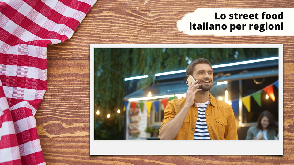 Lo street food italiano per regioni | Filmik na slajdzie przedstawia mężczyznę, który rozmawia przez telefon. Do mężczyzny z tyłu podchodzą dwie kobiety. Kobiety w dłoniach trzymają dania w jednorazowych, papierowych opakowaniach. Kobiety obejmują mężczyznę z a szyję. Jedna z nich przytula się do niego. W tle widoczna jest budka z jedzeniem typu street food. | Ecco 10 piatti dello street food italiano, divisi in regioni, che vi faranno venire l’acquolina in bocca. Oltre a questi ce ne sono ovviamente molti altri, ma non è possibile presentarli tutti. |