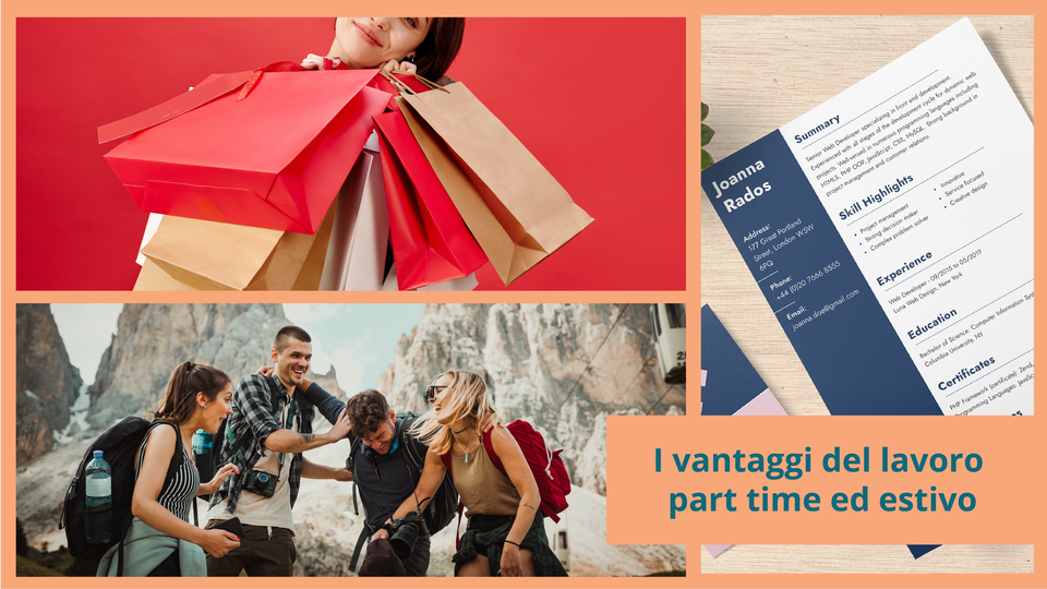 I vantaggi del lavoro part time ed estivo | Ilustracja składa się z trzech zdjęć. Pierwsze przedstawia uśmiechniętą kobietę trzymającą papierowe torby z zakupami. Zdjęcie poniżej przedstawia grupę czworga przyjaciół, dwóch dziewczyn i dwóch chłopaków, na wycieczce w górach. Zdjęcie po prawej przedstawia życiorys jakiejś osoby. Na ilustracji widoczny jest tytuł. | Lavorare in estate o part time è una buona occasione per guadagnare un po’ di denaro e fare le prime esperienze lavorative. Questo tipo di attività ti permette di sviluppare competenze e abilità e inoltre ti consente, per esempio, di pagarti una gita con gli amici o un capo di abbigliamento un po’ particolare. |