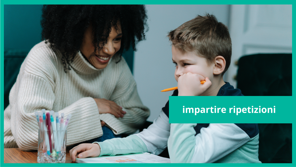 impartire ripetizioni | Ilustracja przedstawia uśmiechniętą kobietę pomagającą w lekcjach chłopcowi. Na ilustracji widoczny jest tytuł. | Se sei bravo in matematica o in inglese o in qualsiasi altra materia, pensa alla possibilità di fare ripetizioni, cioè aiutare nello studio i ragazzi delle classi inferiori o delle scuole medie. Pubblica un annuncio su Internet oppure mettilo sulla bacheca di una scuola vicino a casa tua. |