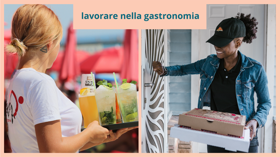 lavorare nella gastronomia | Ilustracja składa się z dwóch zdjęć. Na zdjęciu po lewej kobieta niesie na tacy napoje. Na zdjęciu po prawej widoczna jest dziewczyna w czapce z daszkiem roznosząca pizzę. Na ilustracji widoczny jest tytuł. | Chi vuole provare a lavorare in gastronomia, può fare il cameriere o la cameriera in un locale durante il fine settimana oppure part time durante la stagione turistica – quando molti ristoranti e trattorie hanno bisogno di personale extra. Grazie alle mance, questa attività può diventare fruttuosa. Molte pizzerie e locali hanno anche bisogno di persone che facciano le consegne a domicilio, in motorino o anche in bicicletta. |