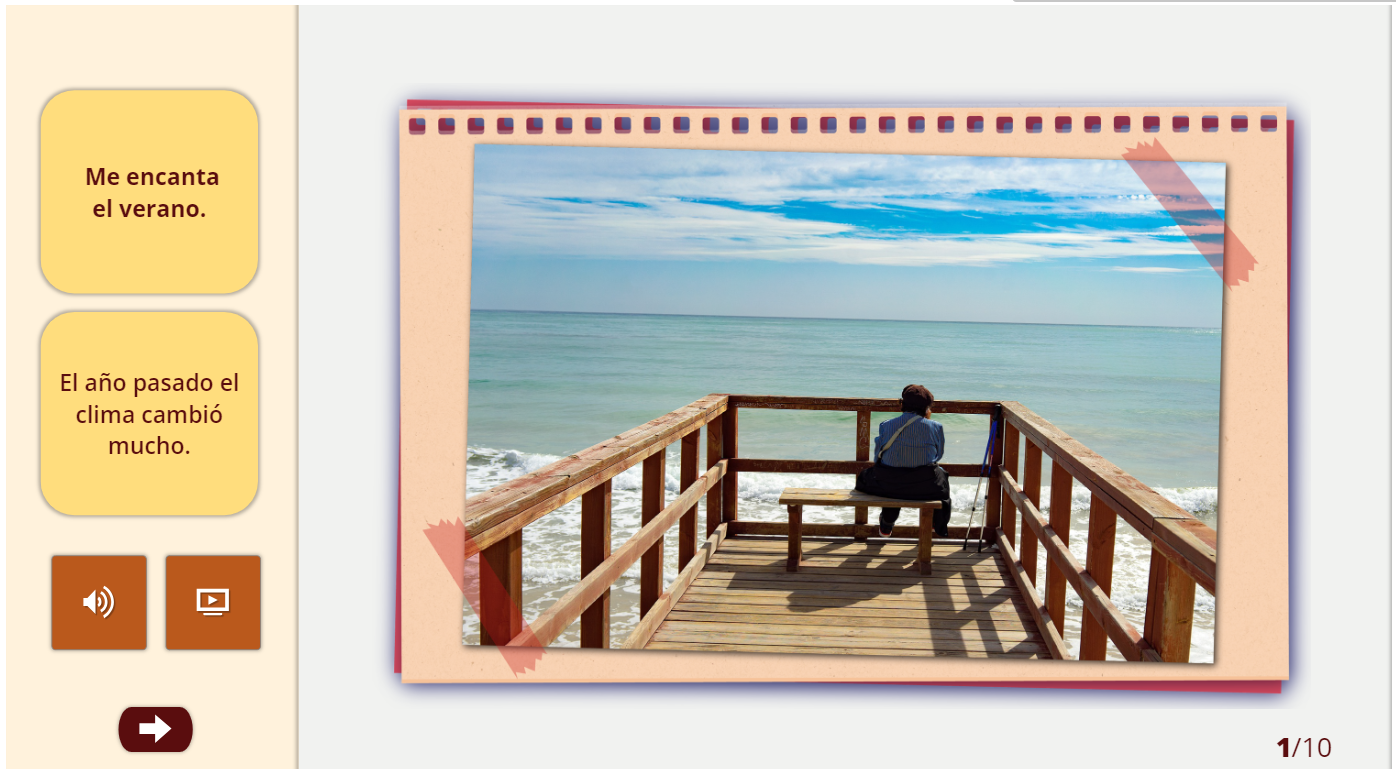 Pierwszy slajd przedstawia osobę siedzącą na ławeczce, na końcu pomostu nad morzem. Opis slajdu: Me encanta el verano. El año pasado el clima cambió mucho. Nagranie dźwiękowe: El último verano fue muy interesante, el clima cambió muchísimo. Por eso, no tuvimos tiempo para aburrirnos. Os voy a contar cómo fueron mis vacaciones. Materiał filmowy przedstawia kwiaty na łące falujące na wietrze w czterech ujęciach. W pierwszym ujęciu widoczne są czerwone drobne kwiaty, następnie różowe i czerwone, później różowe i białe, a w ostatnim ujęciu czerwone. Podpis pod filmem: El verano es la estación más bonita del año.