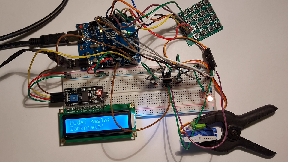 Zdjęcie przedstawia płytkę stykową, na której zamontowane są 3 rezystory prowadzące do diody 4 pinowej. Zamontowano także stabilizator liniowy wraz z 4 kondensatorami, ceramiczne z przodu, elektrolityczne z tyłu. Wokoło układu stabilizującego połączono wiele kabli pomiędzy różnymi komponentami. Połączono kable pomiędzy diodą a układem stabilijącym oraz układem arduino i klawiaturą. Dioda świeci się na czerwono. Na płytce stykowej zamontowano układ konwertera I2C, którego piny podpięte są do wyświetlacza LCD. Na wyświetlaczu widoczny napis: "Podaj hasło: Zamknięte!".