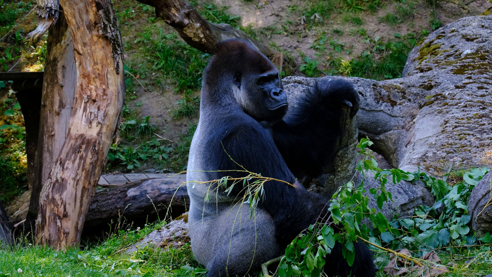 Krótki film przedstawia siedzącego na trawie goryla w ujęciu z boku, zwróconego w prawą stronę. Goryl lewą łapą trzyma do góry. W prawej łapie trzyma gałązkę z zielonymi listkami. Obok niego leżą kolejne gałązki. Goryl rusza paszczą i coś przeżuwa. Po prawej stronie widoczny jest leżący pień drzewa, a po lewej stronie widoczne jest drzewo bez kory. W tle stok porośnięty kępkami trawy..