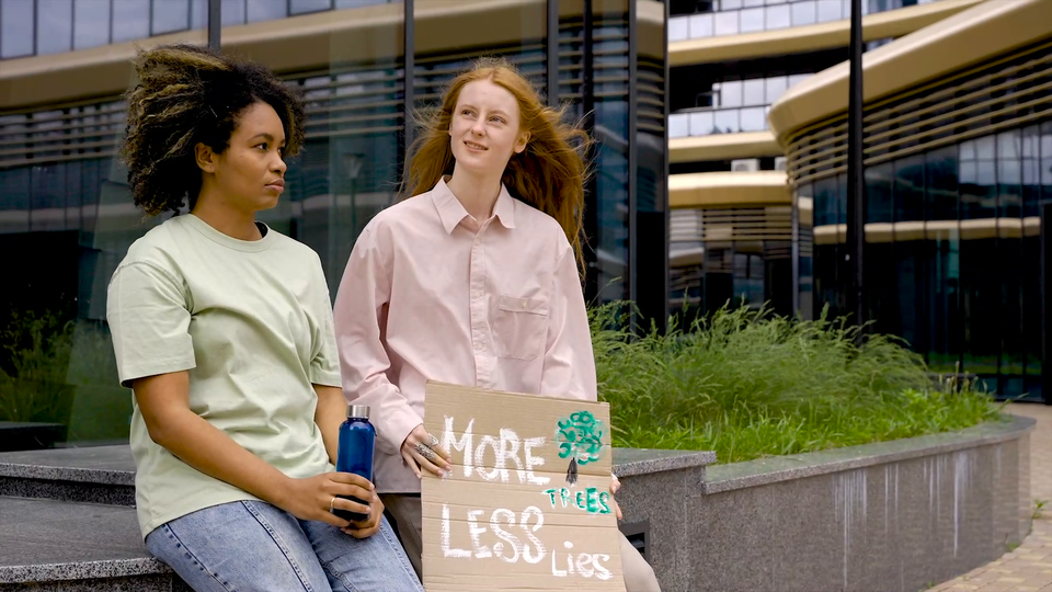 Krótki film przedstawia dwie młode dziewczyny siedzące na wysokim murku klombu i rozmawiające. Dziewczyna po lewej stronie ma długie, ciemne i kręcone włosy, ubrana jest w zielonkawą koszulkę z krótkim rękawem i dżinsy. W rękach trzyma butelkę termiczną w kolorze niebieskim. Dziewczyna po prawej stronie ma długie, proste i rozpuszczone rude włosy, ubrana jest w różową koszulę i spodnie. W ręku trzyma transparent wykonany z kawałka kartonu, na którym widnieje odręcznie wykonany napis w języku angielskim:MORE TREES LESS LIES. SłowoTREES jest namalowane zieloną farbą, a nad nim namalowane jest zielone drzewo. W tle widoczne są nowoczesne budynki.