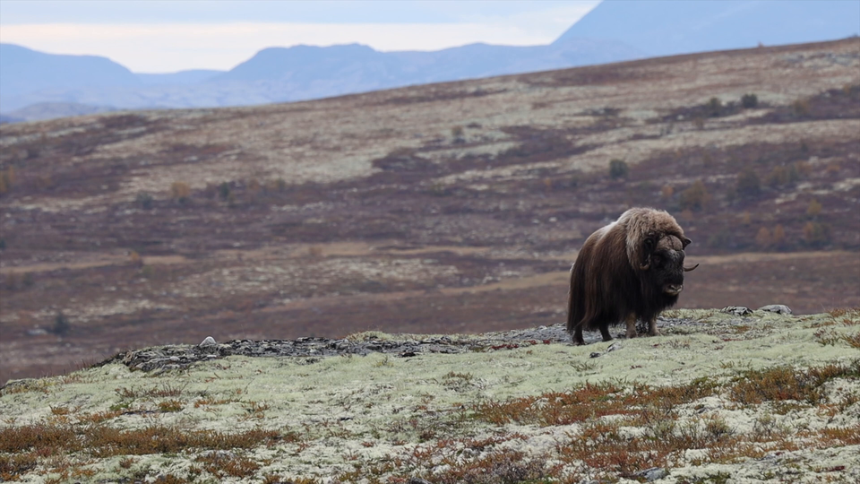 Krótki film przedstawia stado pasących się wołów piżmowych. Widoczne są zwierzęta o masywnej budowie ciała, gęsto porośnięte brązową, długą sierścią. Na głowach zwierząt widoczne są rogi rosnące od dołu w górę, wygięte końcami ku górze. Woły piżmowe widoczne są na skalistym stoku porośniętym niską roślinnością. W tle widoczne są skały..