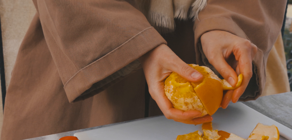 Kilkunastosekundowy klip wideo przedstawia kobietę obierającą owoc pomarańczy.