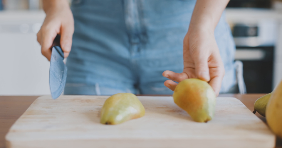 Kilkusekundowy klip wideo przedstawia osobę, która przekraja gruszkę.