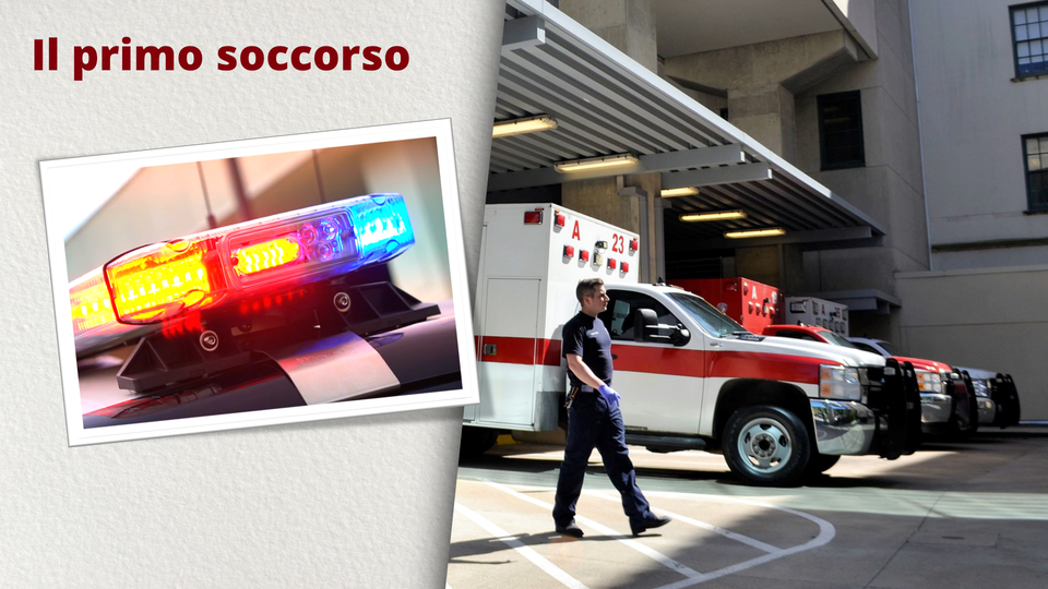Il primo soccorso | Na slajdzie znajduje się krótki filmik i zdjęcie. Na filmiku znajduje się zbliżenie na sygnał świetlny na dachu karetki tzw. „kogut”. Świeci on na żółto‑czerwono. Na zdjęciu znajduje się mężczyzna. Ma na sobie ciemne spodnie, ciemną koszulkę z krótkim rękawem i rękawiczki jednorazowe. Za nim stoją w jednym rzędzie karetki. W tle widoczny jest wysoki budynek. | Il primo soccorso è l'insieme delle azioni che permettono di aiutare, in situazioni di emergenza, una o più persone in difficoltà – vittime di traumi fisici o psicologici o di malori improvvisi, nell'attesa dell'arrivo dei soccorritori qualificati. In molte situazioni, il primo soccorso può salvare la vita al malcapitato o alla malcapitata perché i primi minuti dopo l’infortunio sono spesso i più determinanti per la sopravvivenza e le successive possibilità di terapia. Per questo motivo certamente vale la pena di sapere come prestare il primo soccorso in modo corretto. |