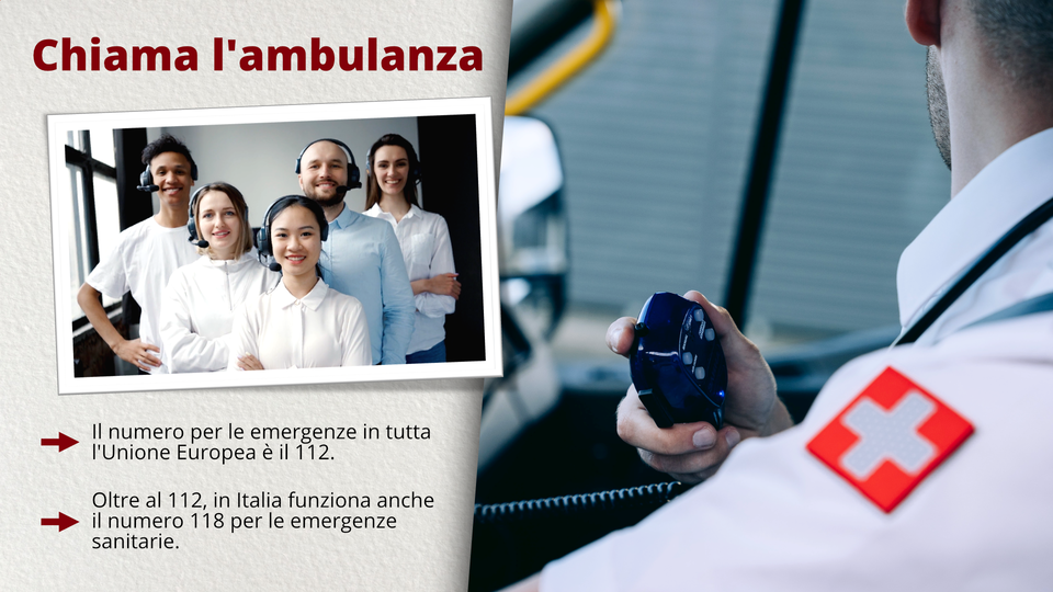 Chiama l’ambulanza | Na slajdzie widoczny jest krótki filmik i zdjęcie. Na filmiku znajduje się grupka młodych ludzi: dwóch mężczyzn i trzy dziewczyny. Młodzi ludzie noszą jasne koszule i słuchawki z mikrofonem na uszach. Na zdjęciu widoczny jest mężczyzna w samochodzie/karetce. Mężczyzna widoczny jest z tyłu. Na ramieniu ma kwadratową plakietkę z krzyżem medycznym. W prawej ręce trzyma krótkofalówkę samochodową. Po lewej stronie znajduje się wypunktowany tekst: Il numero per le emergenze in tutta l’Unione Europea è il 112. Oltre al 112, in Italia funziona anche il numero 118 per le emergenze sanitarie. | Se il malcapitato è cosciente, chiama il numero d’emergenza. In tutta l’Unione Europea funziona il numero 112, in Italia puoi chiamare anche il numero 118 per le emergenze sanitarie. Durante la conversazione con l’operatore del numero di emergenza mantieni la calma e rispondi a tutte le domande. Se la persona non reagisce alla stimolazione e non respira, chiedi a qualcuno di chiamare il numero per le emergenze: non c’è tempo da perdere, bisogna subito iniziare la rianimazione. |