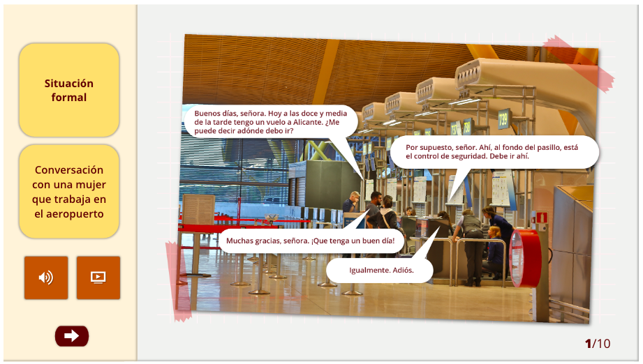 Nagranie dźwiękowe: Julio Fernández González tiene un vuelo importante. Entra en el aeropuerto, pero no sabe adónde debe ir para encontrar su avión. Se acerca al mostrador y decide preguntárselo a la mujer que trabaja allí. Julio y la azafata no se conocen. Son amables, pero hablan de manera formal.