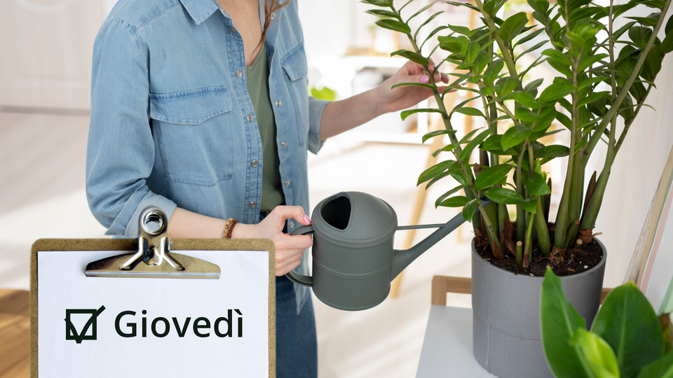 Giovedì | Na slajdzie przedstawiony jest film w formie kolażu zdjęć. Tło stanowi kobieta podlewająca konewką kwiatka w doniczce. W prawym, górnym rogu znajduje się kot jedzący z miski. Poniżej kobieta używa kalkulatora. Na stole znajdują się również kartki, banknoty i zeszyt. | È sempre giovedì. Il pomeriggio Maria annaffia le piante in tutta la casa e prepara da mangiare al gatto Lillo. La sera Maria paga le bollette. |