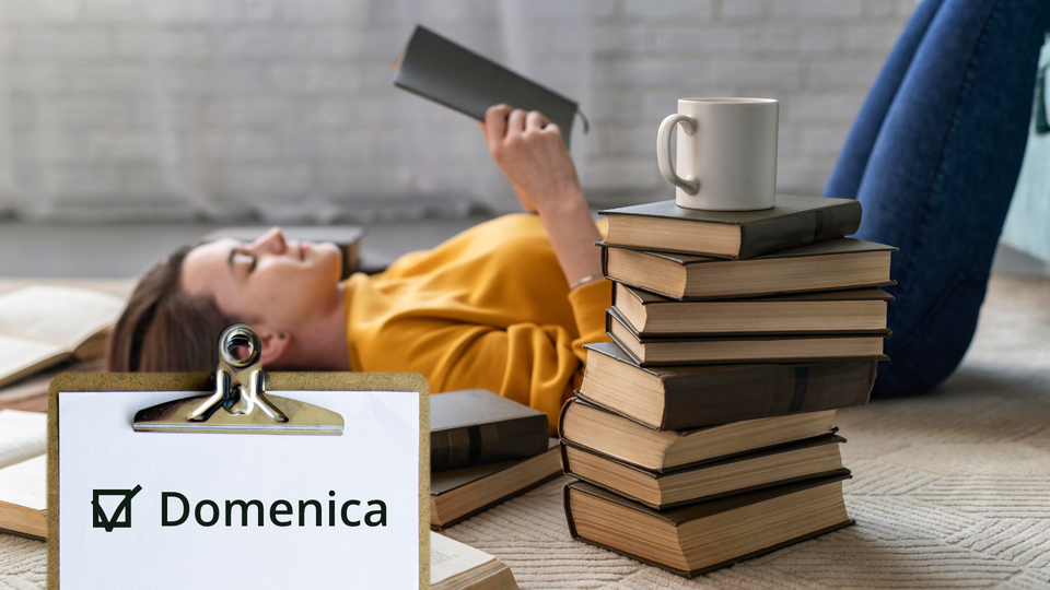 Domenica | Na slajdzie przedstawiony jest film w formie kolażu zdjęć. Tło stanowi kobieta czytająca książkę. Kobieta leży na podłodze, wokół niej porozkładane jest dużo książek. W prawym górnym rogu widoczna jest kartkowana książka. Poniżej nalewana jest czarna kawa do filiżanki. Na dole śpiący mężczyzna. | Finalmente è domenica! Maria e Carlo non devono fare niente. Maria sta leggendo un libro e sta bevendo un cappuccino, Carlo sta facendo un pisolino. |