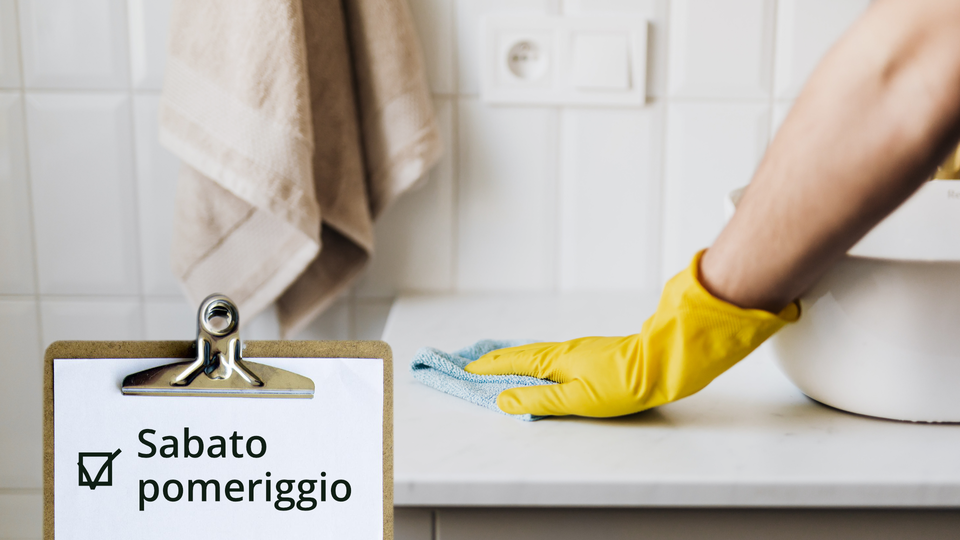 Sabato pomeriggio | Na slajdzie przedstawiony jest film w formie kolażu zdjęć. Tło stanowi osoba w gumowych rękawiczkach myjąca blat w łazience, na którym stoi umywalka. W lewym, osoba w gumowych rękawiczkach myje muszlę klozetową. | È sempre sabato. Maria fa le pulizie in bagno. Pulisce la vasca da bagno, il lavabo e il water. |