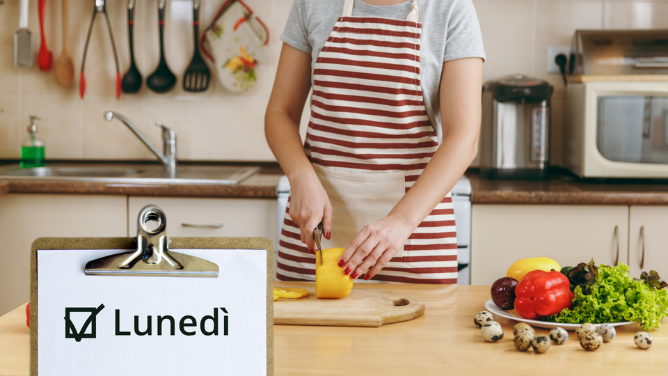 Lunedì | Na slajdzie przedstawiony jest film w formie kolażu zdjęć. Tło stanowi kobieta krojąca żółty ser na desce. Kobieta stoli w kuchni, ubrana jest w fartuszek w poziome paski. W lewym, górnym rogu kobieta rozkłada obrus na stole. W prawym górnym rogu mężczyzna wyciera szklankę, poniżej wkłada brudny talerz do zmywarki. | Oggi è lunedì. Maria sta cucinando il pranzo. Carlo invece sta mettendo in ordine la sala da pranzo e sta apparecchiando la tavola. Dopo il pranzo deve sparecchiare e lavare i piatti. Alcuni piatti li può mettere nella lavastoviglie, ma gli altri li deve lavare a mano. |