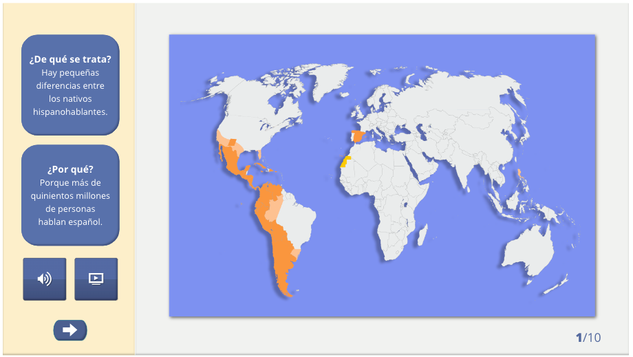 Pierwszy slajd przedstawia mapę świata, na której zaznaczono kraje, w których mówi się po hiszpańsku: Ameryka Północna: Stany Zjednoczone i Meksyk. Ameryka Środkowa: Gwatemala, Salwador, Belize, Honduras, Nikaragua, Kostaryka i Panama. Karaiby: Kuba, Dominikana, Portoryko i w mniejszej mierze Antyle Holenderskie i Wyspy Dziewicze Stanów Zjednoczonych. Ameryka Południowa: Kolumbia, Wenezuela, Ekwador, Peru, Boliwia, Paragwaj, Urugwaj, Argentyna i Chile. Europa: Hiszpania, Andora i w mniejszej mierze Gibraltar. Afryka: Ceuta, Melilla, Wyspy Kanaryjskie, Maroko, Gwinea Równikowa i Sahara Zachodnia. Azja: Filipiny. Oceania: Wyspa Wielkanocna. Opis slajdu: De qué se trata? - Hay pequeñas diferencias entre los nativos hispanohablantes. Por qué? - Porque más de quinientos millones de personas hablan español. Nagranie dźwiękowe: Estamos hablando de un idioma que cuenta con más de quinientos millones de hablantes repartidos por todo el planeta. Por lo general, no hay problemas para entenderse. Sin embargo, hay pequeñas diferencias entre los diferentes países de habla hispana. Materiał filmowy przedstawia stojący na biurku globus, który się kręci. Podpis pod filmem: Sabes que la lengua española es oficial en 21 países?