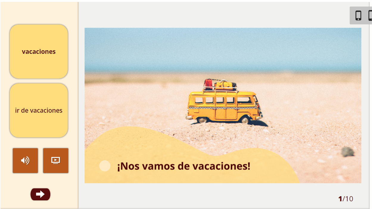 Pierwszy slajd przedstawia samochód typu van z walizkami zapakowanymi na dachu. Stoi na piasku. Podpis na slajdzie: Nos vamos de vacaciones! Opis slajdu: vacaciones ; ir de vacaciones Nagranie dźwiękowe: Miguel: Vas de vacaciones este verano? Nuria: Sí. Voy de vacaciones con mis padres, pero todavía no sabemos adónde ir. Materiał filmowy przedstawia parę spacerującą po plaży. Plaża jest wąską drogą, z obu stron morze. Podpis pod filmem: Te vienes de vacaciones conmigo?