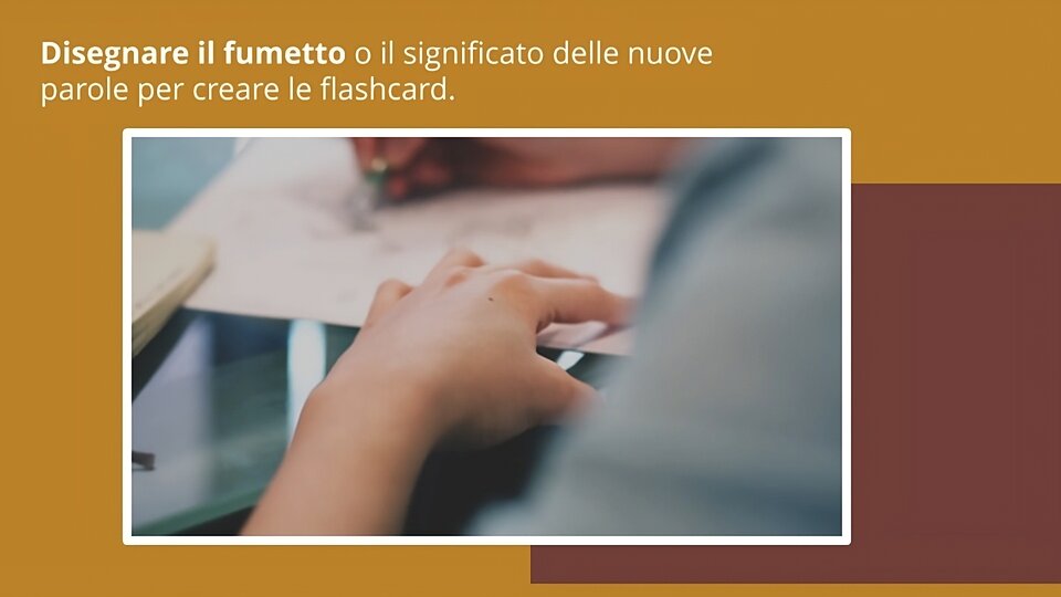 10. | Slajd przedstawia krótki film, na którym ktoś rysuje na kartce. Obok znajduje się tekst: „Disegnare il fumetto o il significato delle nuove parole per creare le flashcard.” | Sei bravo a disegnare? Allora perché non disegni tu un fumetto o il significato delle parole che studi a scuola? Poi mostri i disegni ai tuoi compagni di classe e loro indovinano la parola: così giocate come con le flashcard e ripassate insieme le parole nuove! |