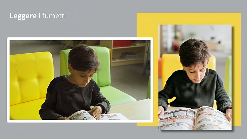 9. | Slajd przedstawia krótki film, na którym młody chłopak przewraca strony w komiksie. Po prawej znajduje się zdjęcie tego samego chłopca czytającego komiks. Powyżej znajduje się tekst: „Leggere i fumetti.” | Non ami la tecnologia, ma la lettura, però studi una lingua straniera da poco? Allora perché non inizi dai fumetti? Hanno molti disegni e poco testo! |