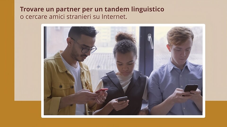 12. | Slajd przedstawia zdjęcie trzech osób, dziewczyny i dwóch chłopaków patrzących w swoje telefony komórkowe. Obok znajduje się tekst: „Trovare un partner per un tandem linguistico o cercare amici stranieri su Internet.” | E cosa fare per praticare la lingua? Grazie a Internet è possibile trovare una persona per uno scambio di tipo tandem linguistico o cercare amici stranieri su Internet. Poi, ogni volta che parli con loro, scambiate messaggi o e‑mail pratichi la lingua! |