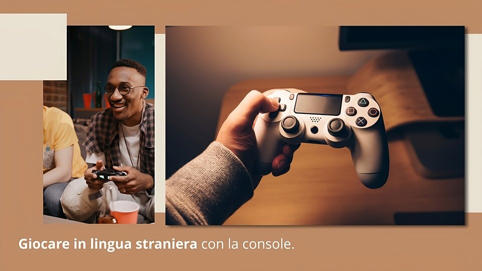 8. | Slajd przedstawia krótki film, na którym młody mężczyzna używa pada do gry na konsoli. Po prawej stronie slajdu znajduje się zdjęcie pada służącego do gry na konsoli. Poniżej znajduje się tekst: „Giocare in lingua straniera con la console.” | Anche quando giochi con la console e imposti un’altra lingua... impari! |