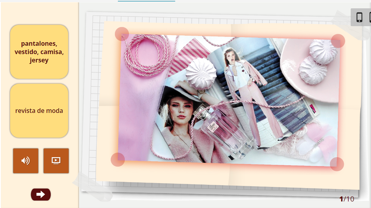 Slajd pierwszy. Grafika główna przedstawia otwarty katalog o modzie, leżący na nim flakon perfum, różowy sznurek oraz bezy na talerzyku. Pojęcia: pantalones, vestido, camisa, jersey; revista de moda. Nagranie: Nuria: Miguel, necesito comprar pantalones, un vestido, una camisa y un jersey. Aquí tengo una revista de moda de una tienda. Vamos a ver qué tienen. Miguel: Vale. Filmik przedstawia dwie osoby przeglądające stronę sklepu z ubraniami na laptopie. Podpis: Antes de ir de compras, siempre vale la pena planificar qué quieres comprar.