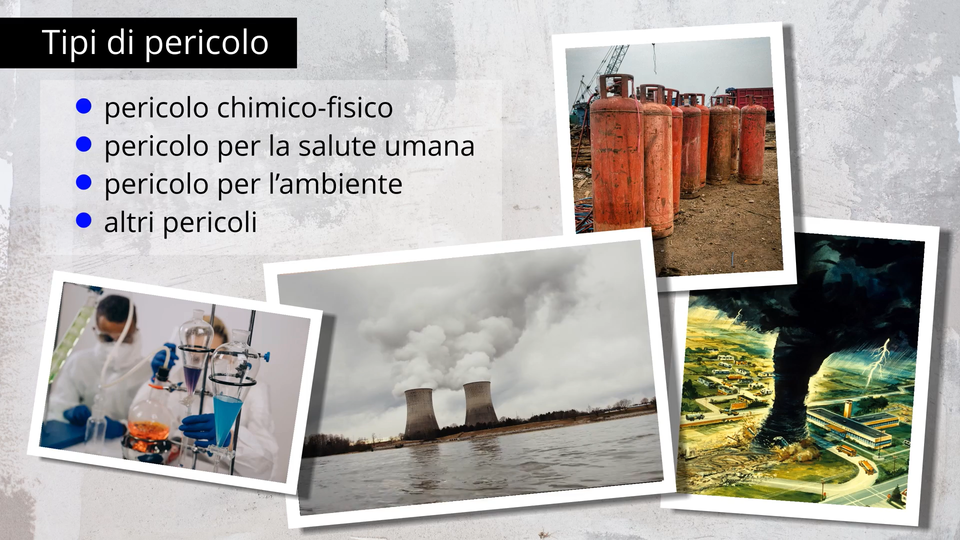 Tipi di pericolo | Slajd zatytułowany jest: Tipi di pericolo i zawiera treść: pericolo chimico‑fisico; pericolo per la salute umana; pericolo per l’ambiente; altri pericoli. Na slajdzie znajdują się trzy zdjęcia i jeden krótki filmik. Pierwsze zdjęcie przedstawia dwie osoby w laboratorium. Kobieta i mężczyzna mają na sobie fartuchy, maseczki i rękawiczki ochronne. Oboje pracują przy różnych kolorowych substancjach. Na drugim zdjęciu znajdują się butle z niebezpiecznymi substancjami. Trzecie zdjęcie przedstawia ciemny dym, trąbę powietrzną unosząca się nad miastem. Zdjęcie zrobione jest z góry. Krótki filmik przedstawia dwa ogromne kominy, z których unosi się dym. Na pierwszym planie znajduje się jezioro lub rzeka. | I pericoli vengono classificati a seconda dell’area in cui possono provocare danni. Si distinguono: pericoli chimico‑fisici (tra cui esplosivo, gas, infiammabile, corrosivo), pericoli per la salute umana (ad esempio altamente tossico, gravi effetti per la salute, effetti meno gravi per la salute), pericoli per l’ambiente e altri pericoli. |
